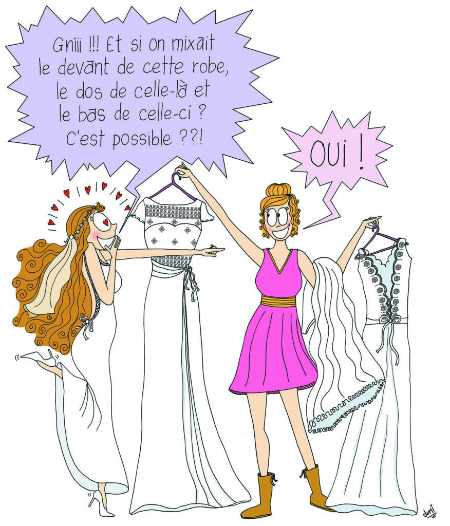 Ce dessin met en scène avec humour le travail de création sur mesure, la transformation de la robe et la complicité qui se crée autour de ce moment unique.